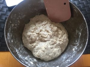 Yön kun muhi niin sitten sekaan 750g (100%) luomu jauhoja, 480g( 64%) vettä ja sen jälkeen sekotetaan. Muista että taikinaa vaan sekoitetaan ei vaivata.
