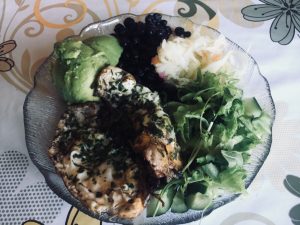 Aamupala Oli tällä kertaa paistetut kananmunat, avocadoa, hapankaalia, tomaattia, kurkkua ja nyt laiton purkkikanaa sekaan kun kananmunat oli niin pieniä. Ja tietenkin salaatteja/yrttejä sekaan.