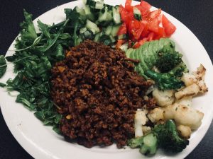Tuttu jauheliha annos jossa nyt oli mukana kukkkakaali ja parsakaali.