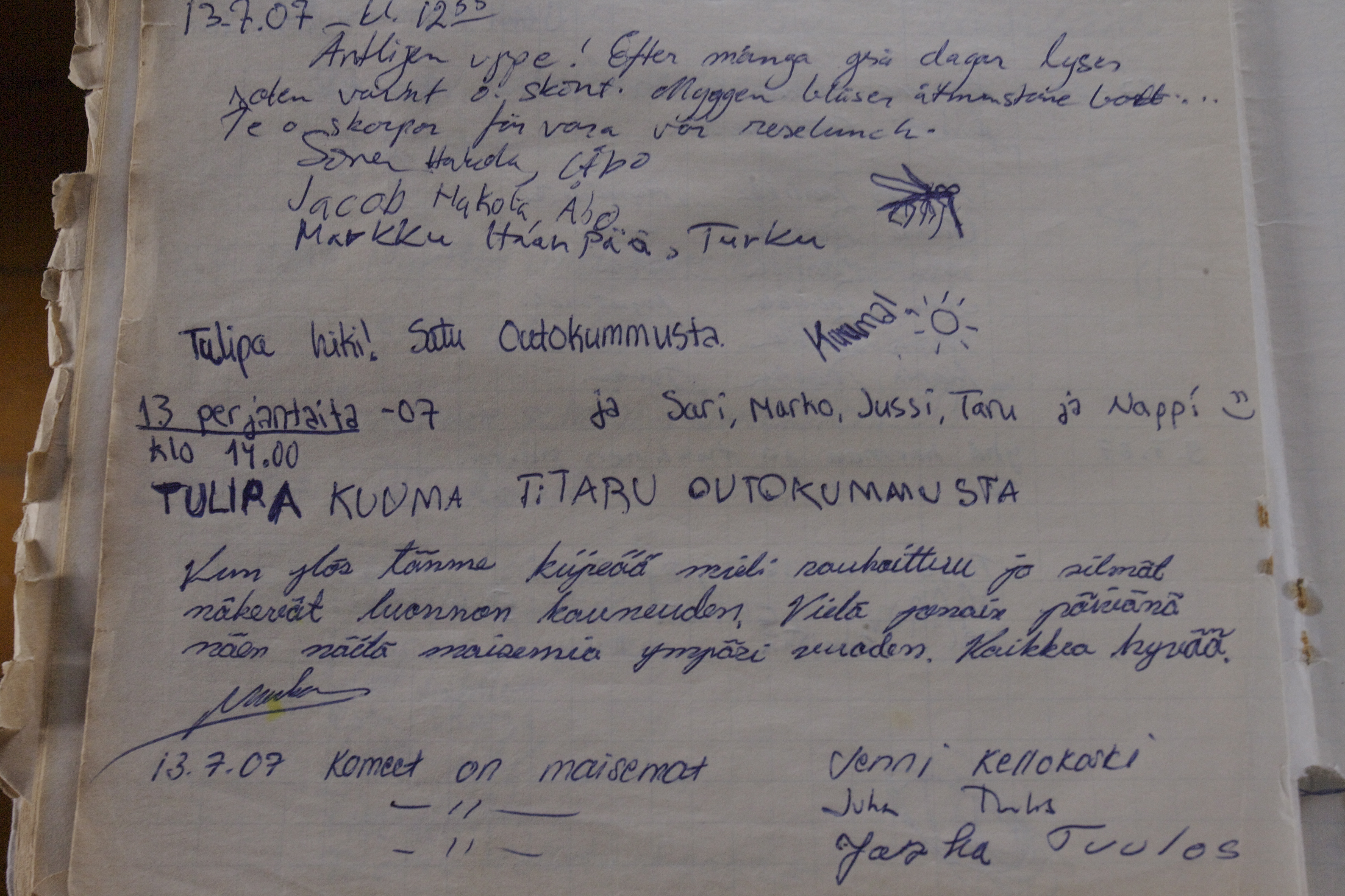 Ylhäällä on metsänvartijan mökki jossa on nykysin vieraskirja, pöytä, lämmitin ja peti jos väsyttää. Vieraskirjaa selatessa löyty meidän käynnin jäljet vuonna 2006 ja 2007.