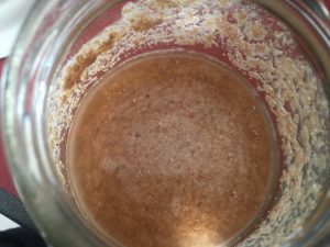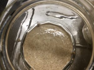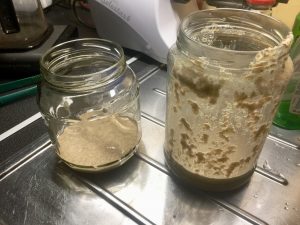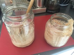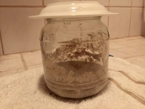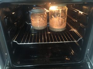 Otin ohjeiden mukaisesti uuden astian ja laitoin 50g juurta siihen ja päälle 50g ruisjauhoja ja 80g vettä. Nyt en laittanutkaan kylppäriin lattialle vaan uuniin jossa on pelkkä valo päällä.