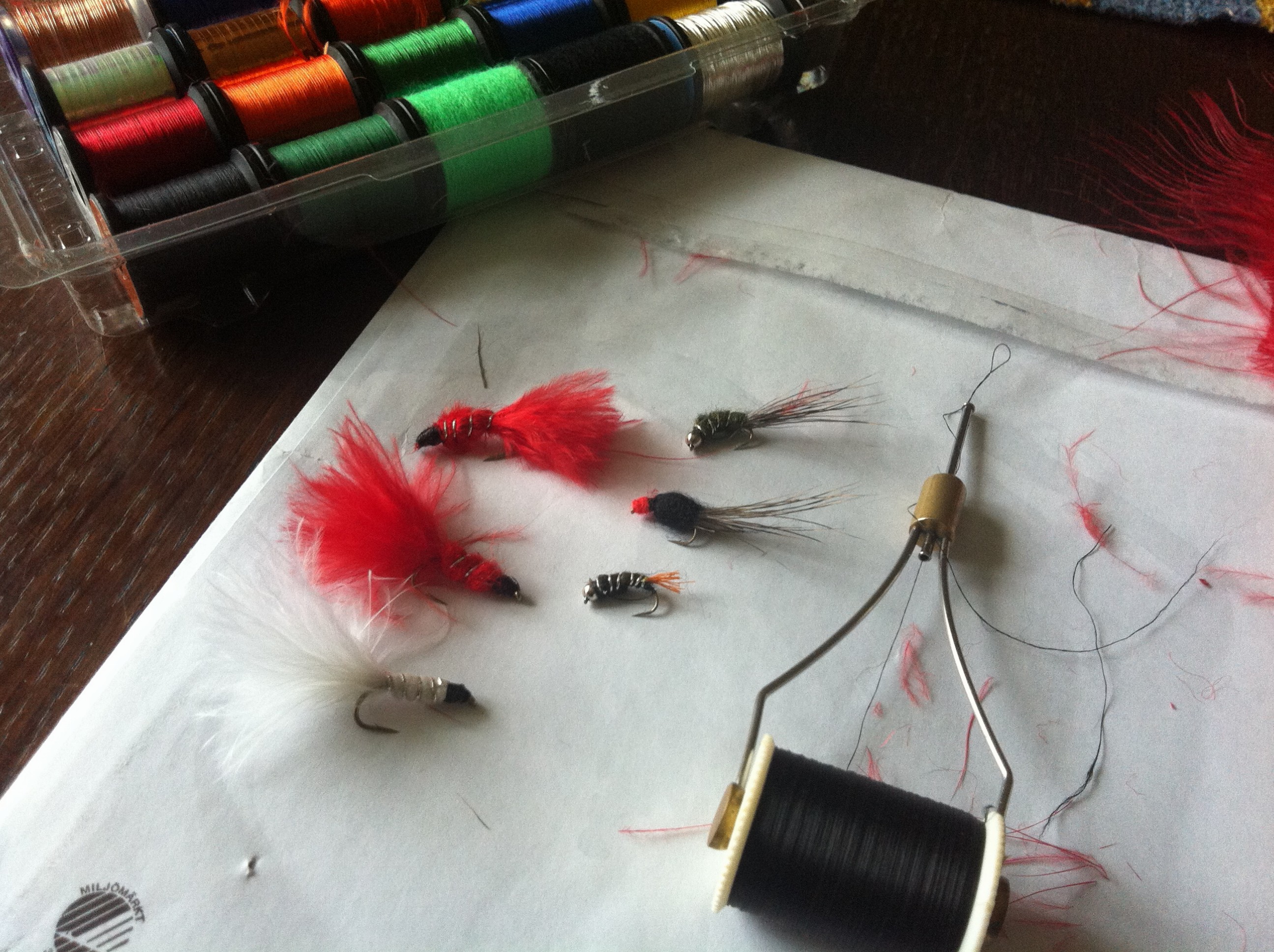 Lääkkeet pikkusen helpotti ja sen jälkeen aloin tehdä perhoja tulevia kalastusreissuja varten. En oo ihan vakuuttunu, että noilla voisi saaha kalaa mutta yrittänyttä ei laiteta 😀 Mahtaa se olla melekonen riemu kun ensimmäinen kala nousee omalla tekemällä perholla 😀