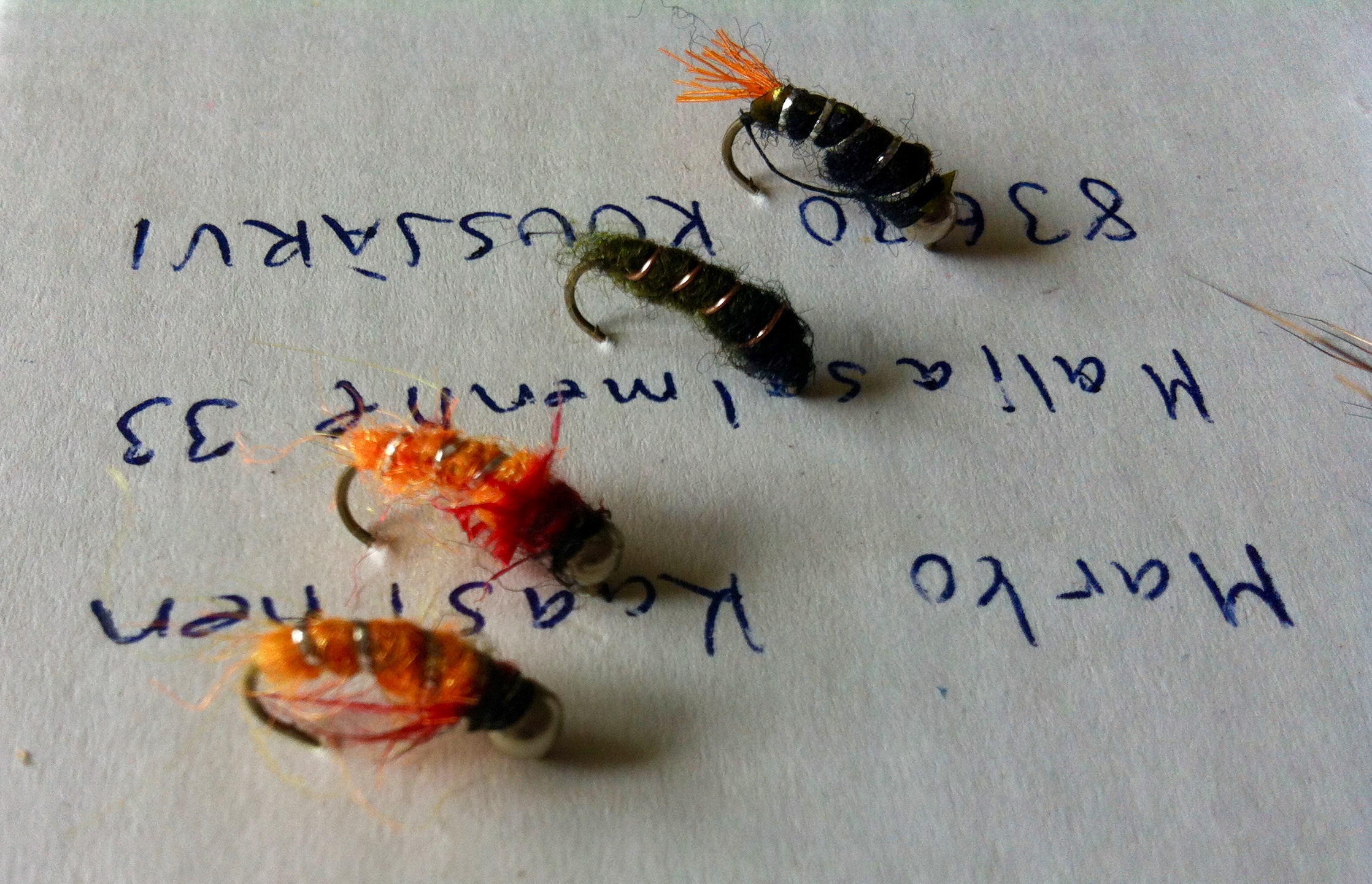 Nyt olen saanu sidottua jo aikamoisen läjän eri perhoja mutta vaan liitsejä ja noita lärvoja. Nyt oon jo tehty omiakin juttuja sitoessa eli lisänny karvoja sinne tänne ja väreillä kikkaillu.